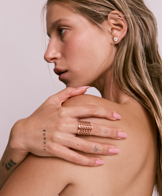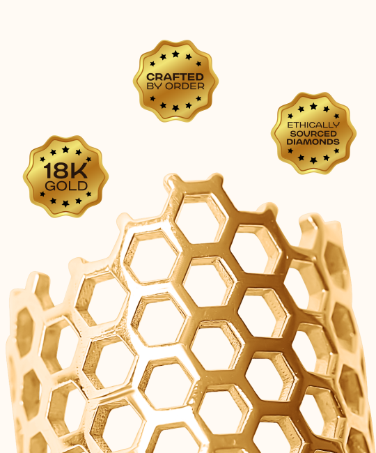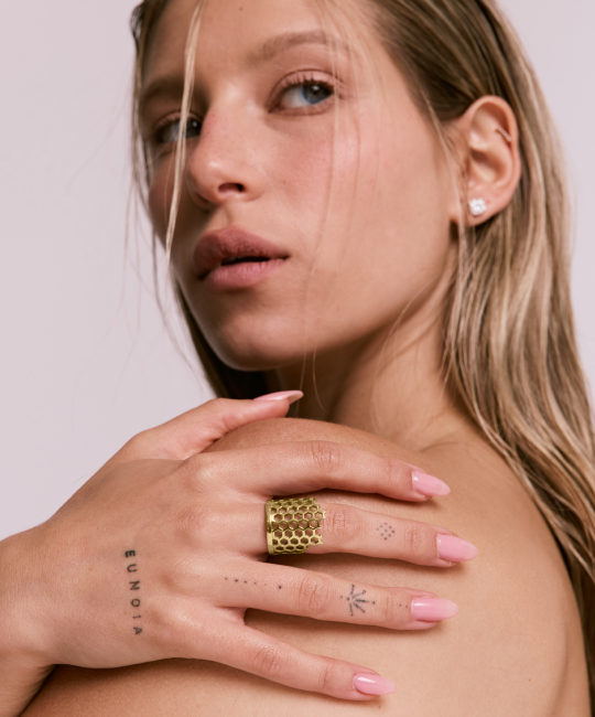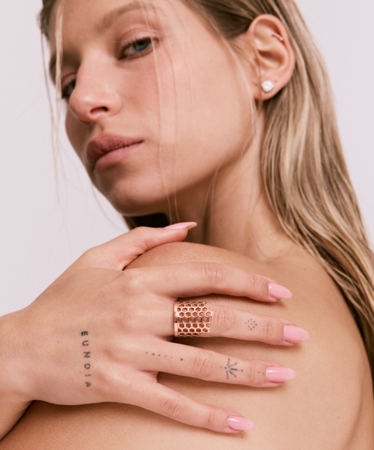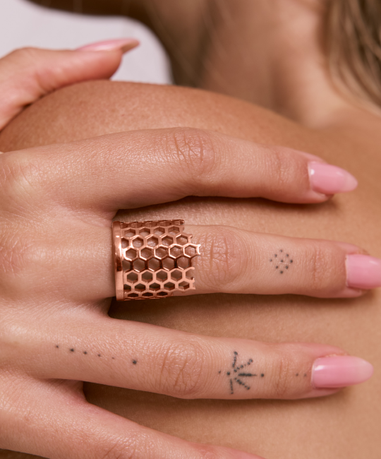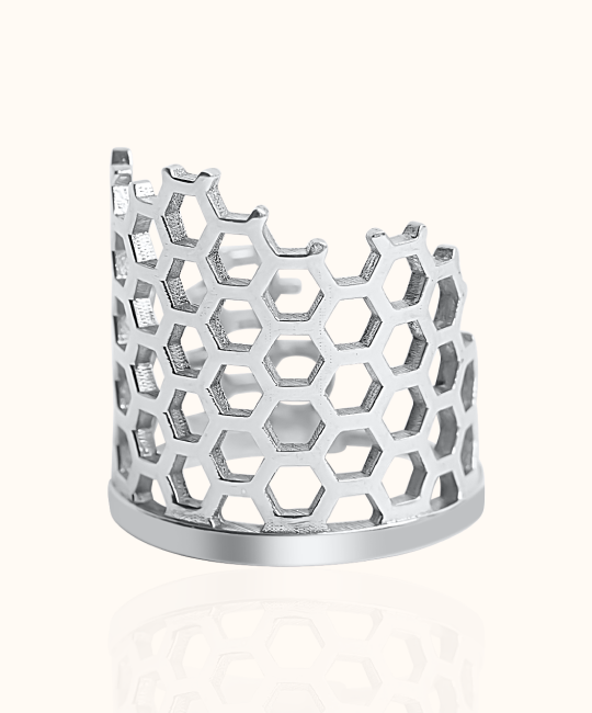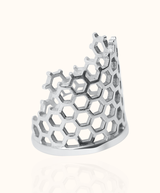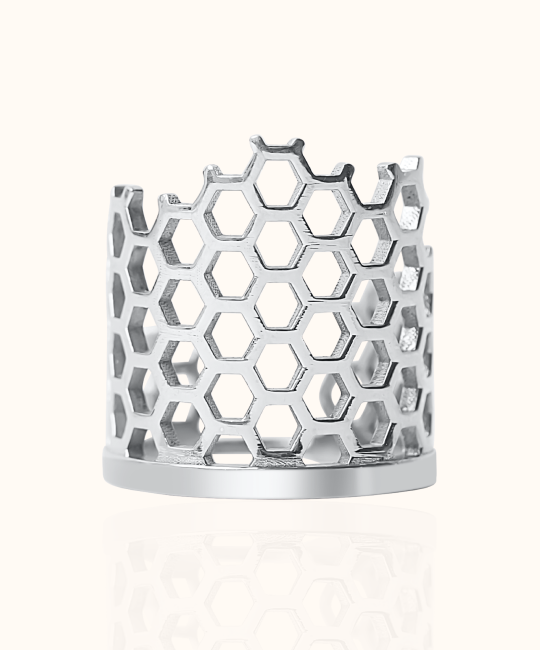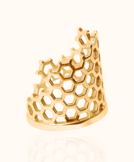 טבעת BEEHIVE שואבת את האינטליגנציה של הכוורת - מבנה יציב, צורות משתלבות, חזרה אינסופית. העיצוב האורגני שלה מחקה את המשושה הטבעי, הצורה היעילה ביותר בטבע, שהופכת כאן להצהרה של עוצמה שקטה.